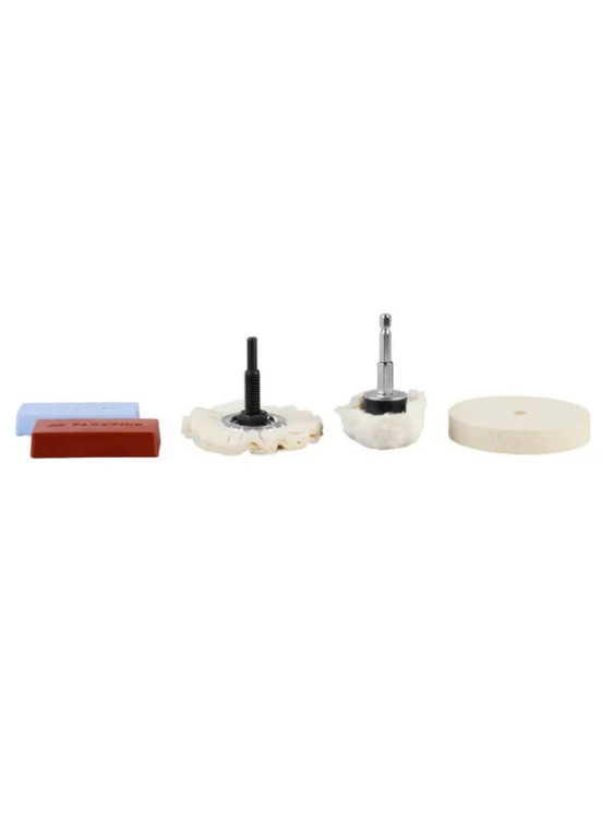 اقلام همراه: 1 عدد دیسک پولیش . 1 عدد خمیر پولیش قبل از پولیش (قهوهای). 1 عدد دیسک سنباده پنبهای . 1 عدد خمیر پولیش بعد از پولیش (آبی). 1 عدد دیسک پولیش قارچی شکل . 2 عدد دیسک گیره. سنبه شامل سختافزار نصب