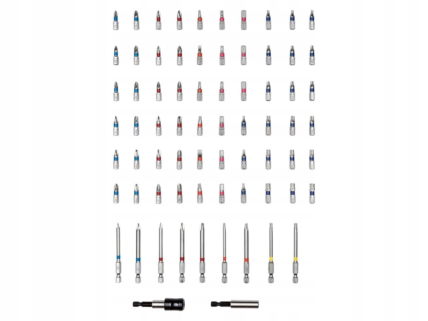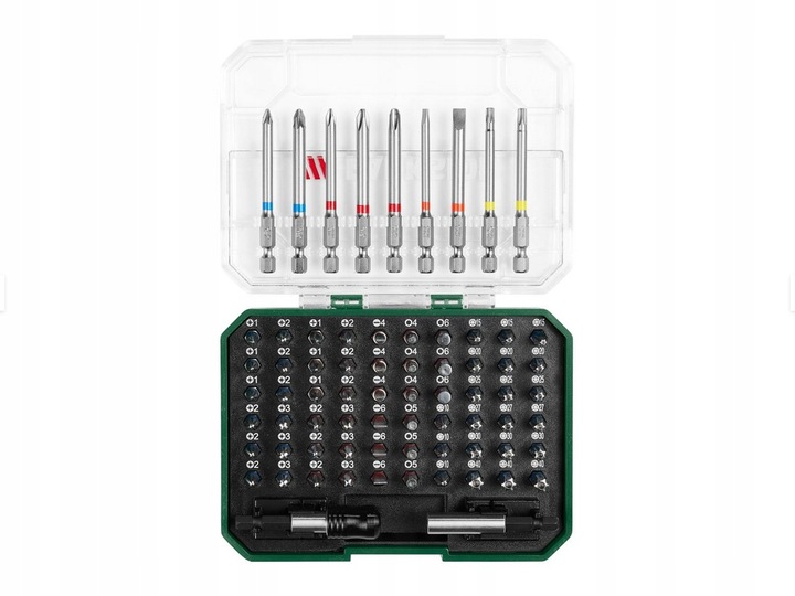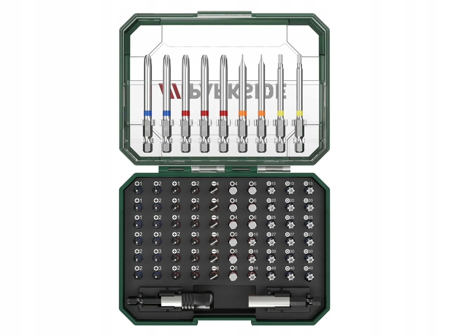 مجموعه پارک ساید بیت ۷۱ قطعه برای پروفیلهای سر پیچ ۶۹ بیت با کد رنگی در مهمترین اندازهها متههای ۲۵ میلیمتری: ۱۲ عدد PH، ۱۲ عدد PZ، ۶ عدد تخت، ۲۱ عدد ستارهای با سوراخ، ۹ عدد ششضلعی متههای ۷۵ میلیمتری: ۳ عدد PH، ۲ عدد PZ، ۲ عدد تخت، ۲ عدد ستارهای شکل ۱ عدد نگهدارنده بیت مغناطیسی مواد فولاد کروم-وانادیوم ابعاد تقریباً ۱۵.۸ در ۱۲ در ۳.۹ سانتیمتر